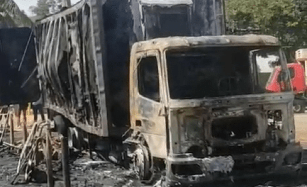 Um incêndio destruiu dois caminhões e nove motos em frente a uma unidade da fábrica de alimentos da Pif Paf, em Visconde do Rio Branco, na...
