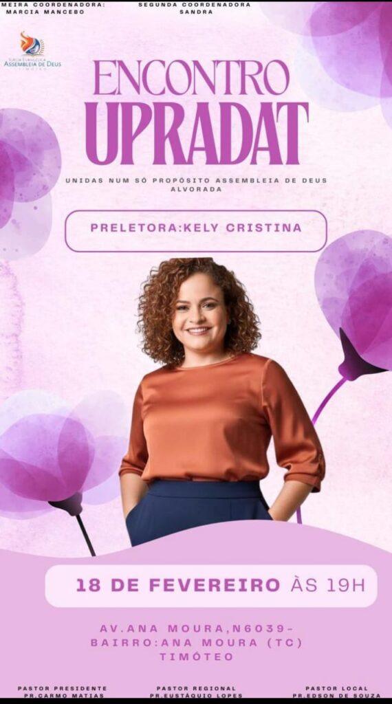 A preletora é a irmã Kely Cristina. Os louvores contarão com participação do coral da UPRADAT, que reúne integrantes das congregações das ADs do Alvorada, Vale Verde, Ana Moura (templos de cima e de baixo), Novo Tempo, Garapa e Bandeirantes.
