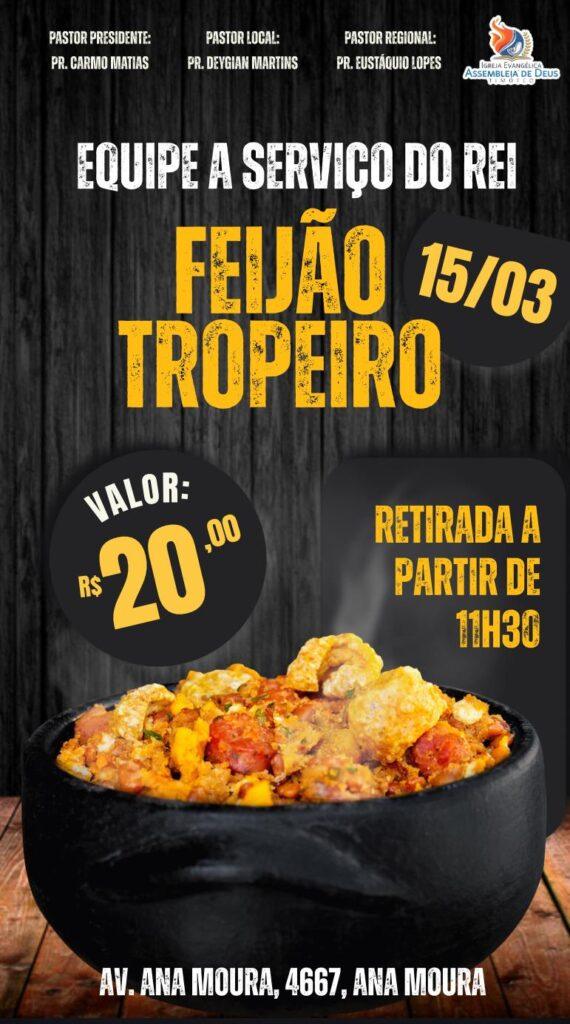 Visando à arrecadação de recursos financeiros para custear uma cruzada evangelística que vem sendo delineada pela equipe “A Serviço do Rei”, da Assembleia de Deus do bairro Ana Moura, templo de baixo, sob a direção do pastor Deyian Martins, um feijão-tropeiro, cujos ingressos poderão ser adquiridos a R$20 (vinte reais), foi programado para o dia 15 de março, a partir das 11h30, no templo, à avenida Ana Moura, 4667.