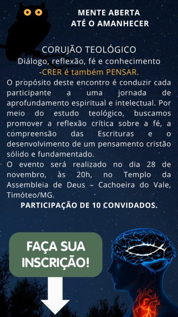 A Igreja Assembleia de Deus de Cachoeira do Vale realizará uma noite “Corujão Teológico”: diálogo, reflexão, fé e conhecimento, crer é também pensar. Serão 10 expositores, 10 temas de teologia sistemática e mais de 50 perguntas, com disposição para permanecer até o amanhecer.
