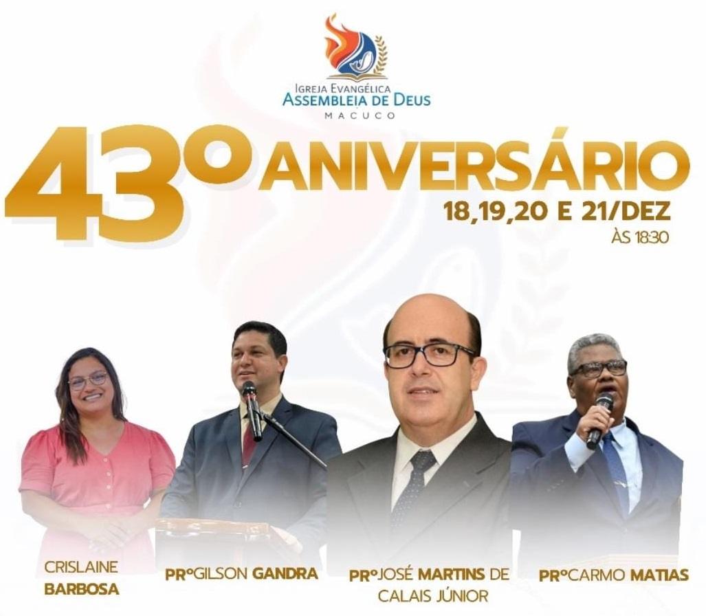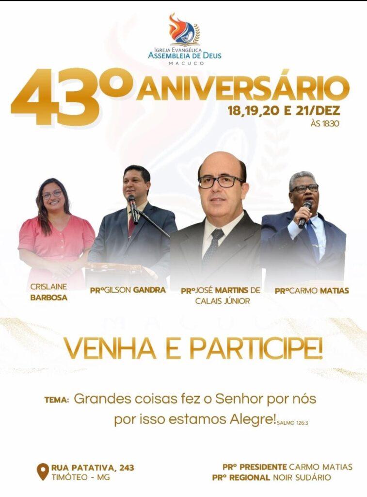 Começam na próxima quinta-feira (18) as comemorações alusivas ao 43º aniversário de fundação da Assembleia de Deus do bairro Macuco, uma das regionais da AD Timóteo e sob a direção do pastor Noir Camilo.