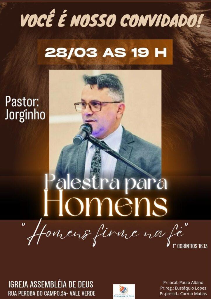 Mas, na AD Vale Verde, unidade sob a direção do pastor Paulo Albino, e ligada à regional do Alvorada, os homens decidiram tirar um dia para se reunirem em um evento especial, onde ouvirão, como palestrante, o pastor Jorginho.