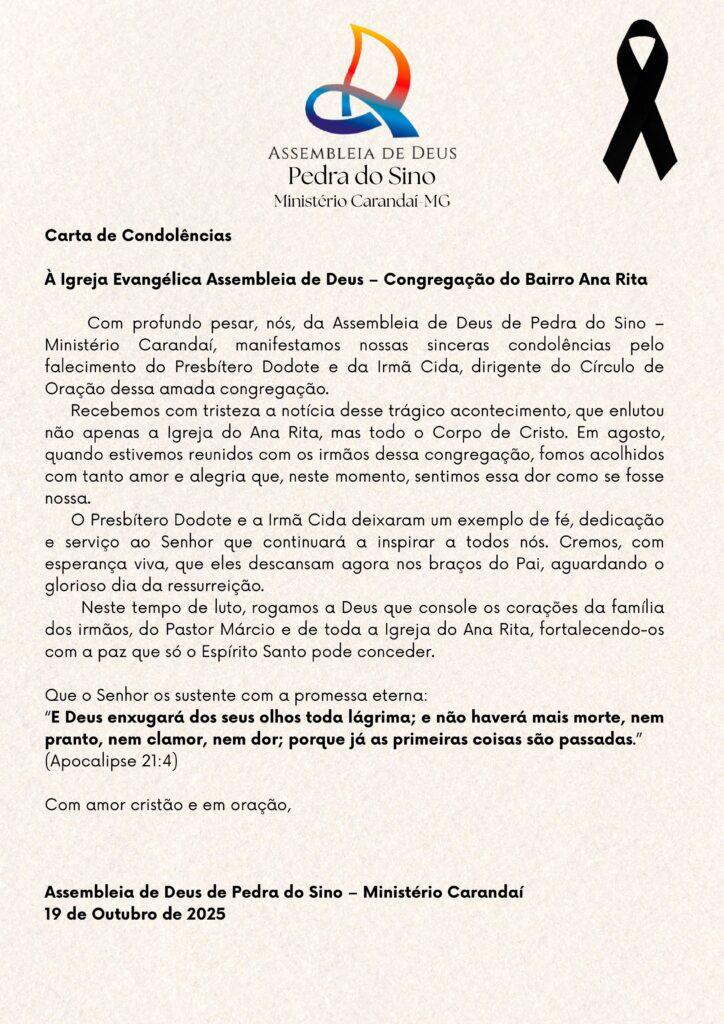 A Assembleia de Deus de Pedra do Sino, ligada ao Ministério de Carandaí, emitiu uma Carta de Condolência aos familiares e fiéis da Assembleia de Deus do bairro Ana Rita, em Timóteo, pela morte do presbítero Nilson Caio Carneiro, o Dodote, e sua esposa, Aparecida, ocorridas dia 16 de outubro de 2025.