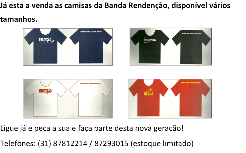 CAMISAS PROMOCIONAIS DA BANDA REDENÇÃO, DA ASSEMBLEIA DE DEUS DE CACHOEIRA DO VALE, JÁ ESTÃO DISPONÍVEIS…