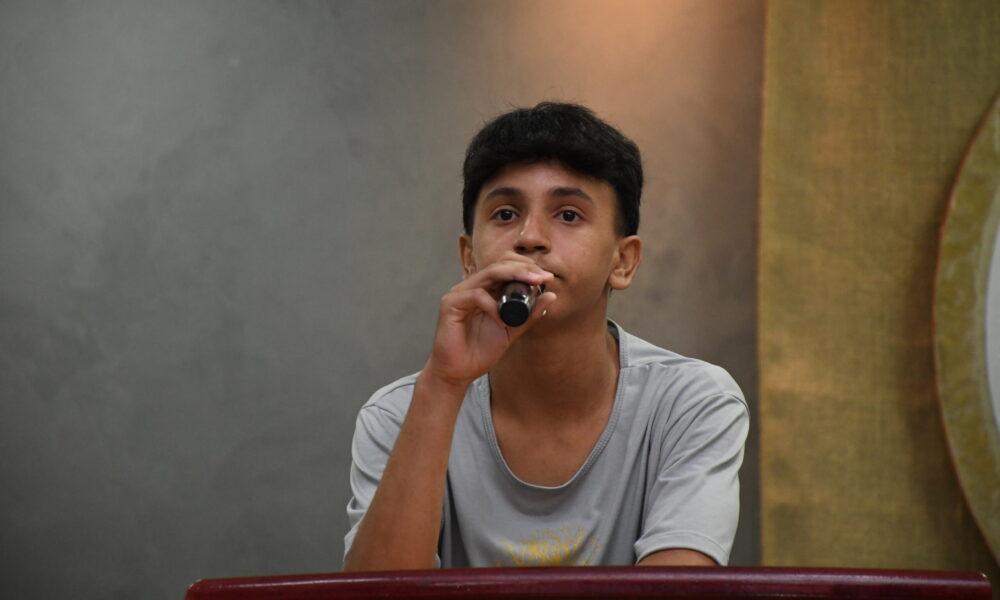 O garoto, da imagem acima, com 14 anos (ele completou no dia seguinte) surpreendeu ao ser convidado para cantar durante o encerramento da festa da juventude...