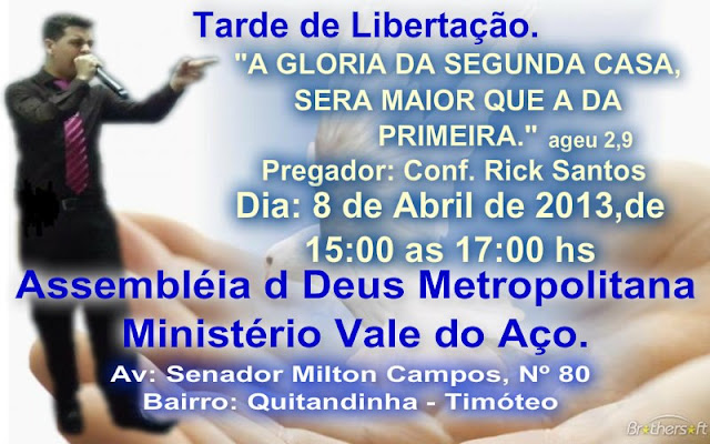 A Assembleia de Deus Metropolitana Ministério Vale do Aço, sob a presidência do Pr. Adriano Silva promove, nesta segunda-feira, a partir das 15h, com previsão de durar até às 17h, a Tarde de Libertação, com o tema “A Glória da segunda casa será maior que a da primeira”.