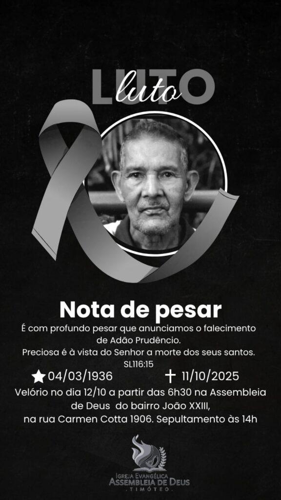 O velório do irmão Adão Prudêncio, falecido neste sábado (11), aos 89 anos, está previsto para ocorrer no templo da Assembleia de Deus do bairro João XXIII, onde ele congregava, a partir das 6h30 de amanhã, domingo (12), a partir das 6h30. O sepultamento será na mesma data, às 14h.