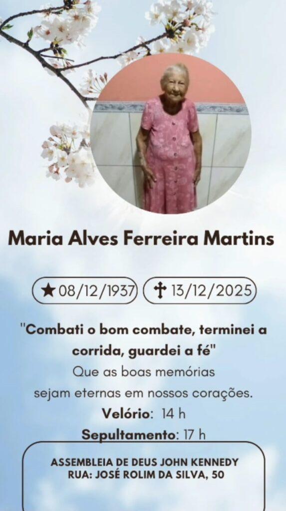 Comunicamos, com pesar, o falecimento da irmã Maria Alves Ferreira Martins, da Assembleia de Deus do bairro John Kennedy.