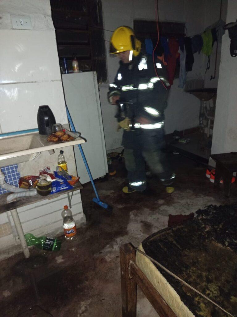 As chamas consumiram uma cama, um aparelho celular e uma tomada elétrica. Antes da chegada dos bombeiros, moradores conseguiram controlar o incêndio.
