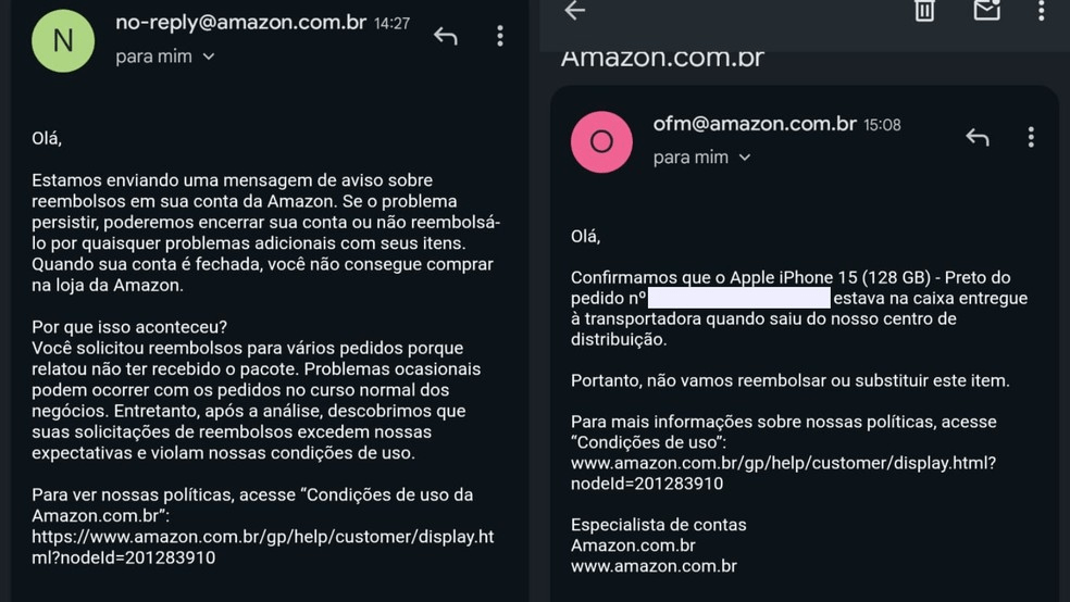 Na tarde desta quarta-feira (28), o cliente recebeu mais dois e-mails da empresa (veja imagem acima). Um informava que ele não seria reembolsado pelo celular comprado em janeiro deste ano, enquanto o outro repetia que a conta dele poderia ser encerrada após ele ter solicitado reembolso para vários pedidos.