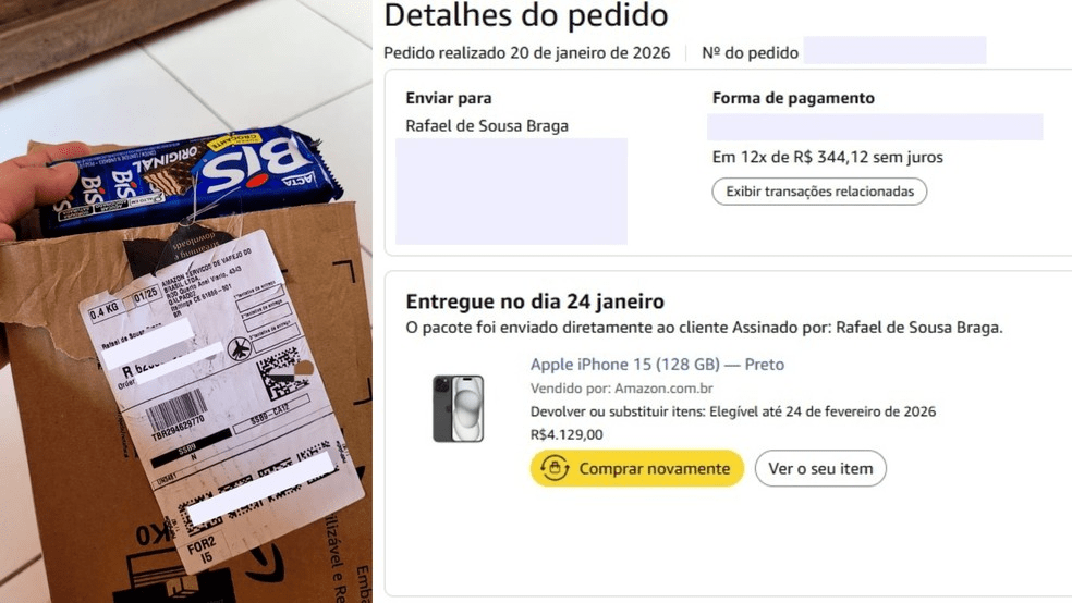 Acostumado a fazer compras pela internet, o enfermeiro Rafael Braga, de 35 anos, teve uma surpresa desagradável no último sábado (24). No pacote que recebeu das mãos do entregador, ele esperava encontrar o iPhone que havia comprado no valor de R$ 4,1 mil. Dentro da encomenda, veio uma caixa de chocolates Bis.