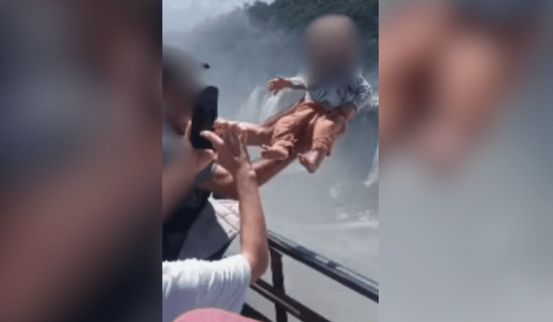 Conforme as informações, a cena foi registrada na terça-feira (17) por turistas que estavam no mirante. A imagem mostra o homem erguendo o bebê no ar, a poucos metros da queda d’água, enquanto uma mulher fotografa.
