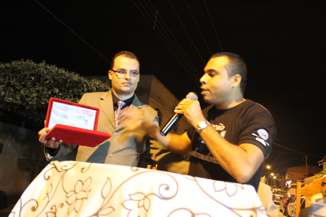 Pr. Juscelino exibe a placa concedida ao amigo, Pr. Virley.