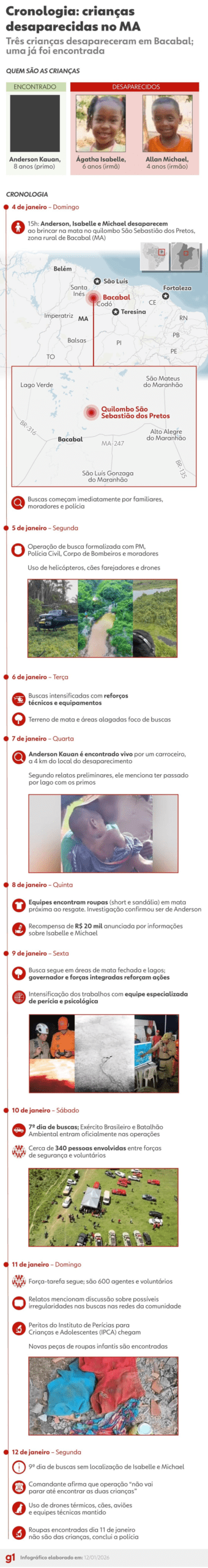 Anderson Kauã, de 8 anos, primo de Ágatha Isabelly, de 6, e de Allan Michael, de 4 anos — desaparecidos há mais de 10 dias em Bacabal (MA), foi encontrado a cerca de 500 metros da chamada “casa caída”, localizada em área de mata fechada, próxima às margens do rio Mearim, no interior do estado.