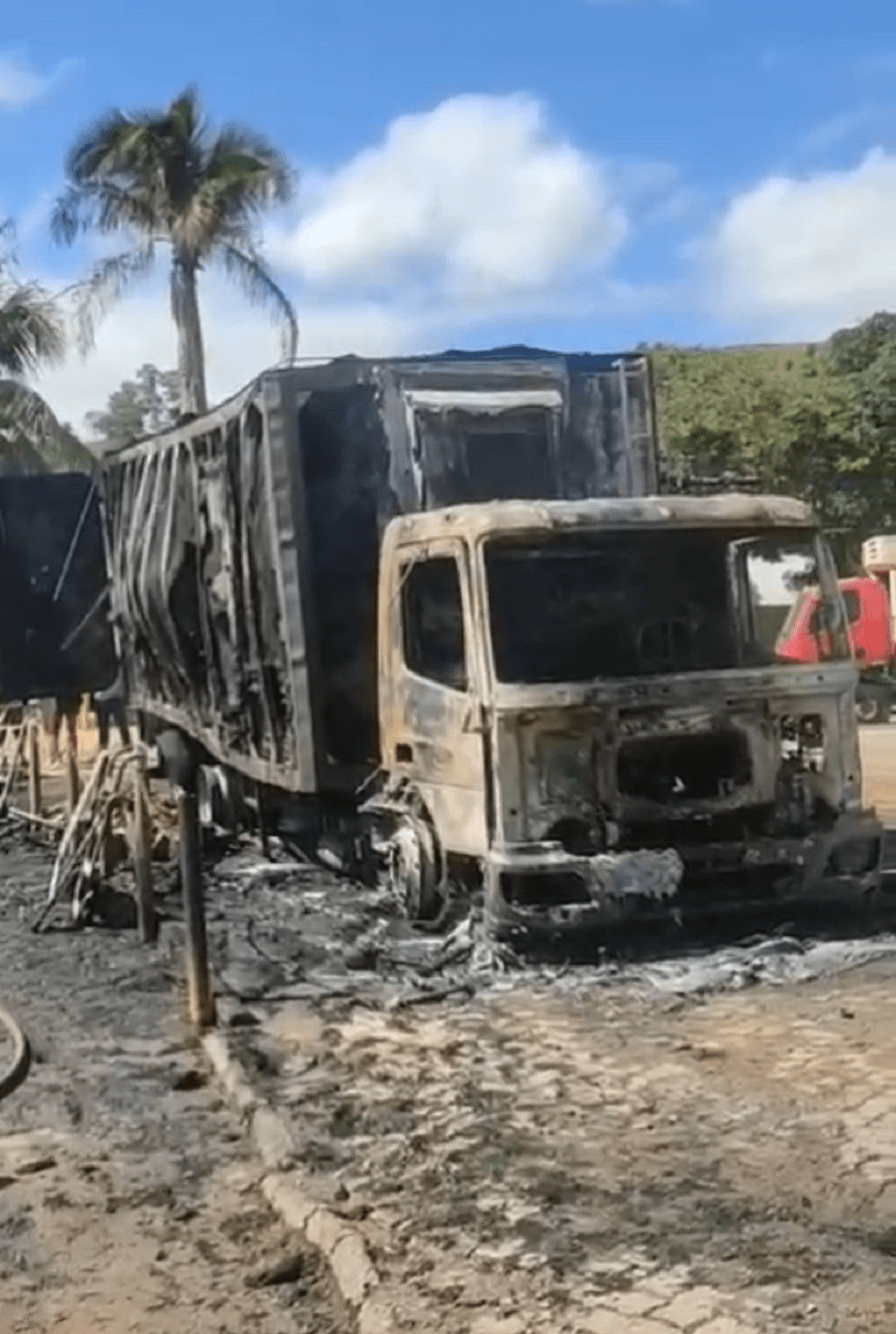 Um incêndio destruiu dois caminhões e nove motos em frente a uma unidade da fábrica de alimentos da Pif Paf, em Visconde do Rio Branco, na Zona da Mata mineira.