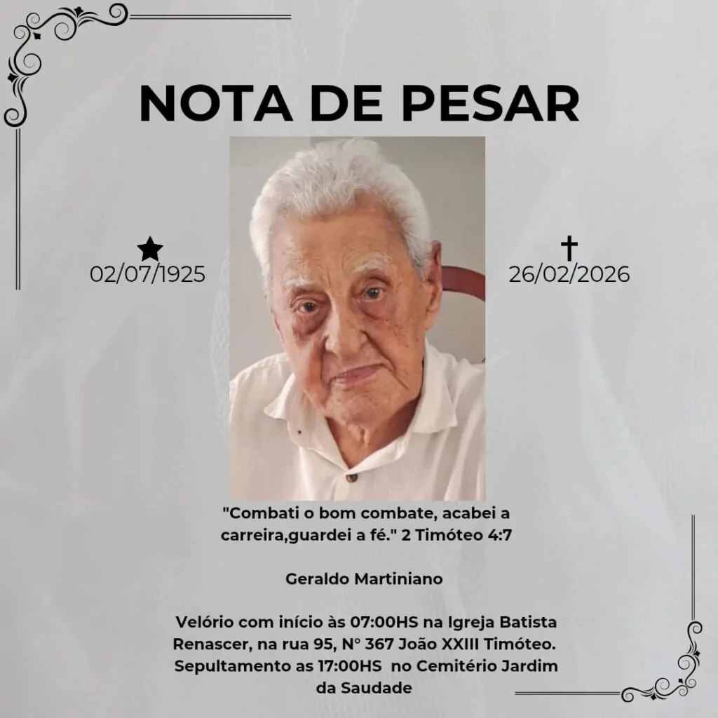 A família do irmão Geraldo Martiniano comunica seu falecimento, ocorrido nesta quinta-feira (26). Entre os filhos que ficam estão a Dora (esposa do pastor Ailton, da Igreja Batista Renascer, do João XXIII) e Daniel (esposo da Neuza, da Assembleia de Deus do bairro Olaria).