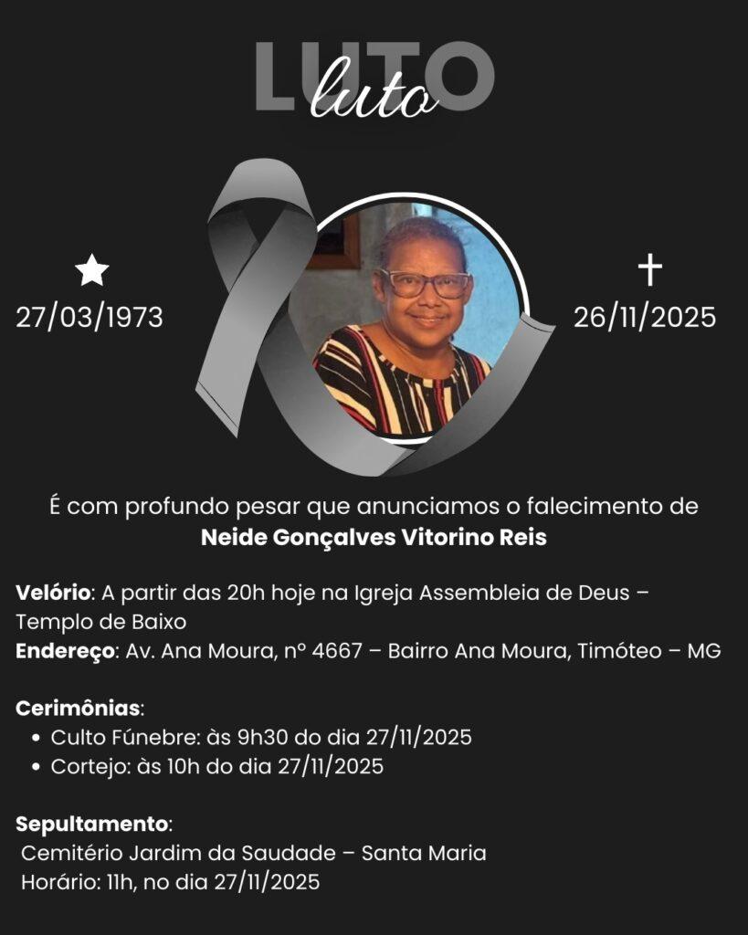 O culto fúnebre será às 9h30 da quinta-feira (27), o cortejo às 10h e, o sepultamento, às 11h da mesma data, no cemitério Jardim da Saudade, no bairro Santa Maria, em Timóteo/MG. Neide é irmã da cantora Nilza Reis, da Assembleia de Deus do bairro Ana Moura.