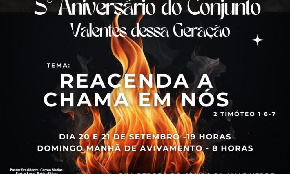 O conjunto Valentes dessa Geração, da Assembleia de Deus do bairro Vale Verde, estará em festa nos dias 20 e 21 de setembro, no templo, a...