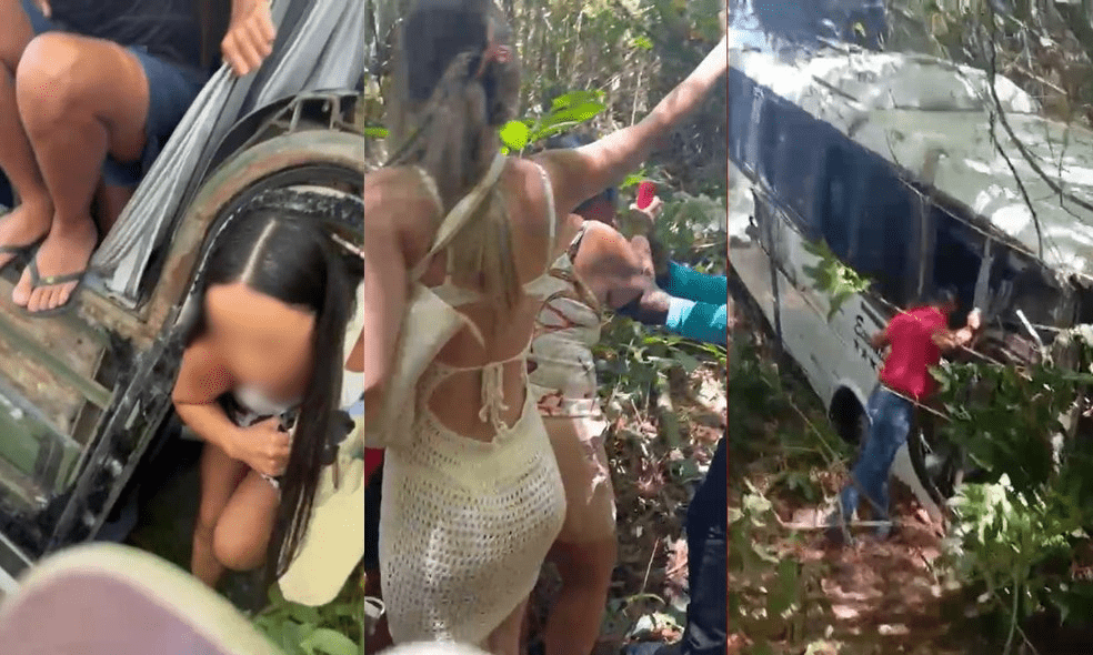 Vídeos feitos no local do acidente mostram os passageiros saindo do ônibus pelas janelas do veículo. (Veja vídeo acima)