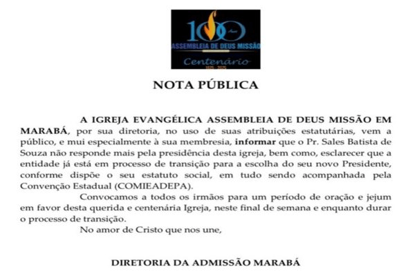 O pastor Sales batista de Souza foi afastado da presidência da Assembleia de Deus Missão, em Marabá, no Pará (PA), após denúncias envolvendo uma crise familiar. A decisão foi comunicada pela diretoria da igreja em nota divulgada nas redes sociais nesta sexta-feira (26/12).