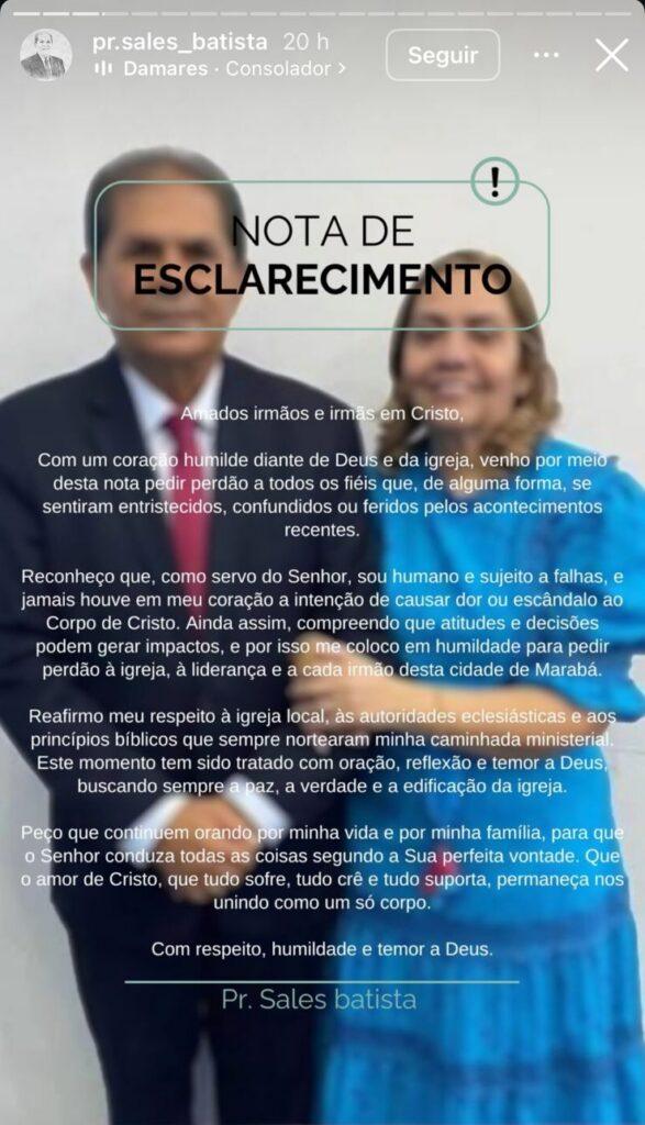 O pastor Sales Batista se pronunciou publicamente na noite deste sábado (27) após o escândalo que abalou a comunidade evangélica de Marabá, no sudeste do Pará. Em nota divulgada nas redes sociais, o líder religioso pediu perdão aos fiéis e afirmou ser “humano e sujeito a falhas”, após ter seu nome envolvido em um caso de traição familiar.