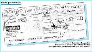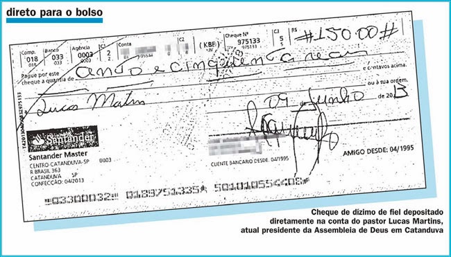 Três cheques entregues como dízimo à Assembleia de Deus de Catanduva de 2012 para cá foram depositados diretamente nas contas de dois pastores da igreja, entre eles o atual presidente, Lucas Martins, sem passar pela conta bancária da entidade. Além disso, outros seis cheques foram depositados em lojas de eletrodomésticos, pneus e um supermercado da cidade.