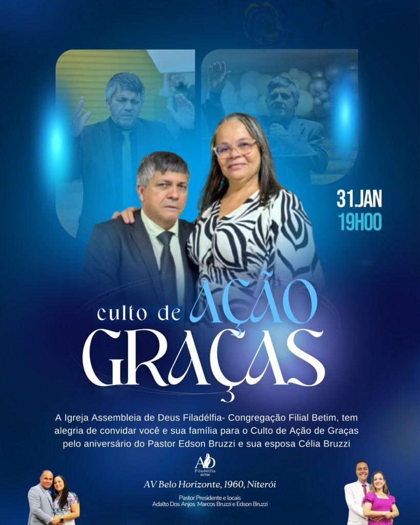 Um culto pela passagem do seu aniversário, transcorrido dia 27 de janeiro, foi alvo de ação de graça pelos fiéis do Ministério de que, ora, faz parte. “O culto foi uma bênção; tivemos a presença de vários obreiros de outras congregações, obreiros e congregados da nossa igreja sede que fica localizada no bairro Nazaré, em Belo Horizonte, bem como vários amigos que vieram alegrar comigo e minha esposa pela passagem do nosso aniversário”, comentou.