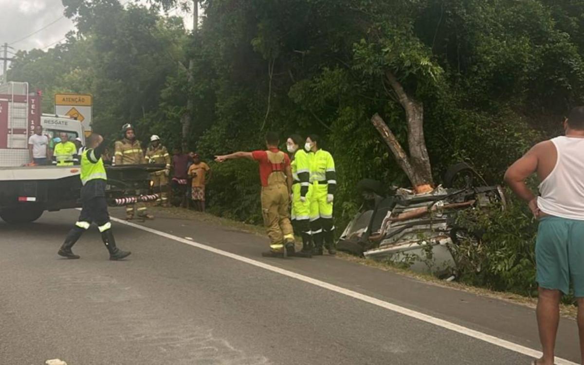 Pelo menos três pessoas morreram e outra ficou gravemente ferida após o carro capotar e bater em uma árvore, na manhã deste domingo (8), em Camaçari, na Região Metropolitana de Salvador (BA).