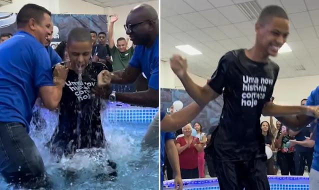 Após confirmar que estava pronto, ele desceu às águas e emocionou a todos ao levantar, pulando e se alegrando na presença do Senhor.